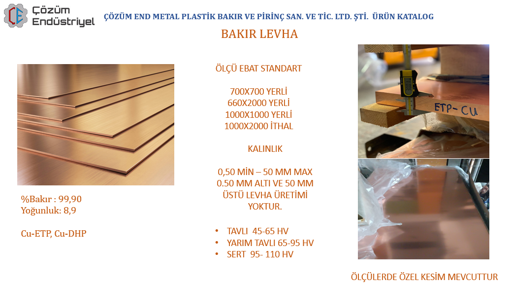 • Çözüm Endüstriyel olarak, yüksek kaliteli ve farklı ebatlarda bakır levha ürünlerini stoktan hızlı teslim avantajıyla sunuyoruz. İhtiyacınıza özel kesim ve teknik destek hizmetlerimizle projelerinize değer katıyoruz.